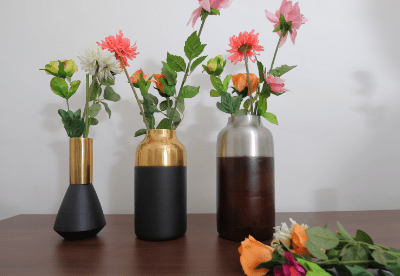 A vase is an open container made of ceramic, metal, wood, aluminum, brass etc.